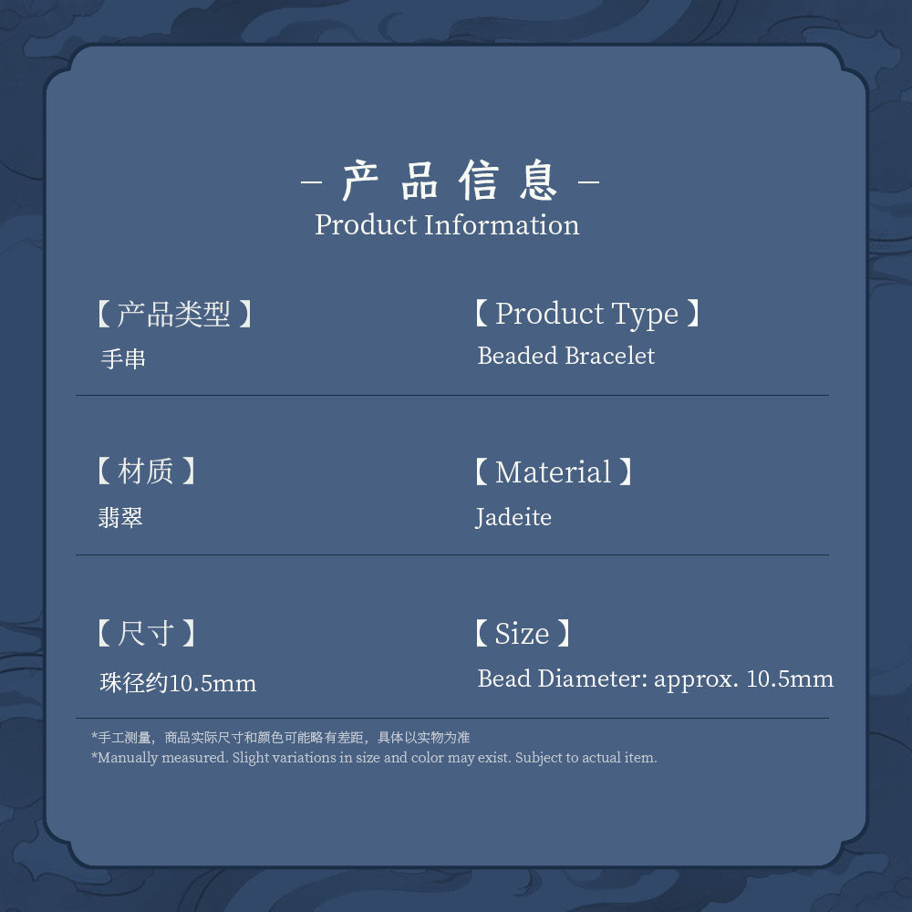 We select natural jade—warm in texture, vibrant in green. Each bead is meticulously polished to showcase its natural luster and texture, with harmonious, elegant color combinations. It infuses your life with serene yet vibrant vitality.