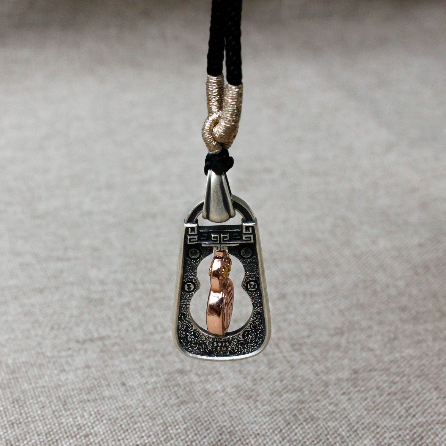 Crafted with an antiqued finish for a classic look, the pendant features a rose-gold plated reversible gourd design with detailed textures and full relief engraving, adding a luxurious touch. Beyond its refined craftsmanship, it carries deep cultural meaning. Pixiu, the gourd, and the Yujianer rune are all core symbols of Chinese spiritual tradition, ensuring that this piece is not merely decorative but truly protective.