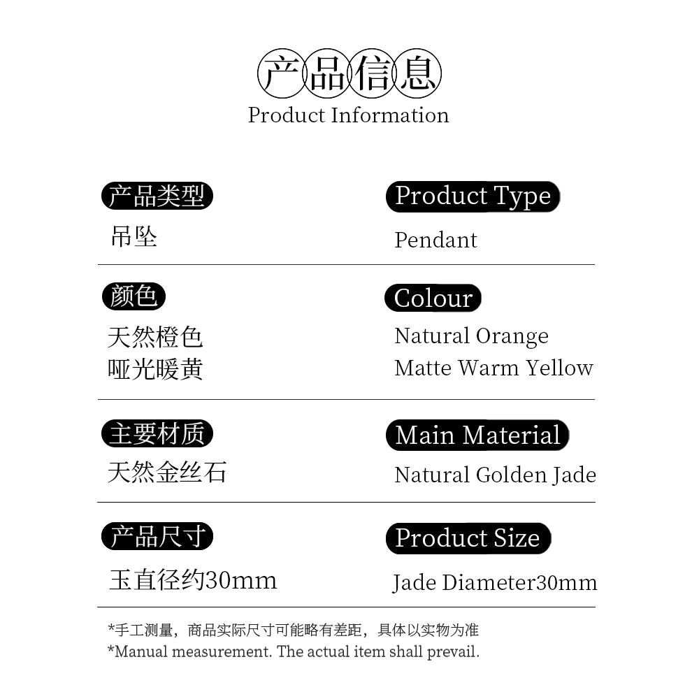 Material: 30mm natural Golden Silk Jade, dual orange-yellow clasps, adjustable cotton-linen hand-woven cord.
