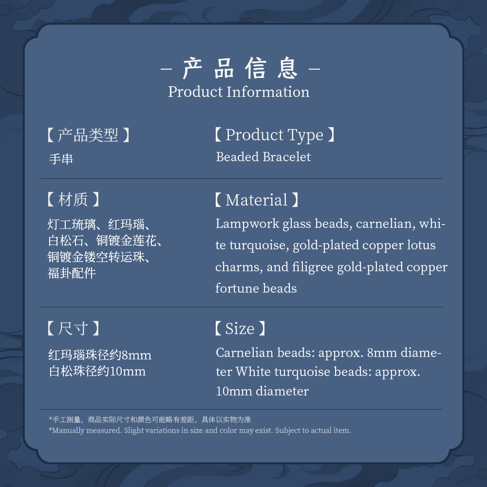 Material: White turquoise, red agate, lampwork glass, gilded copper lotus, gilded copper hollowed-out fortune beads, imperial sand fortune-telling accessory parts