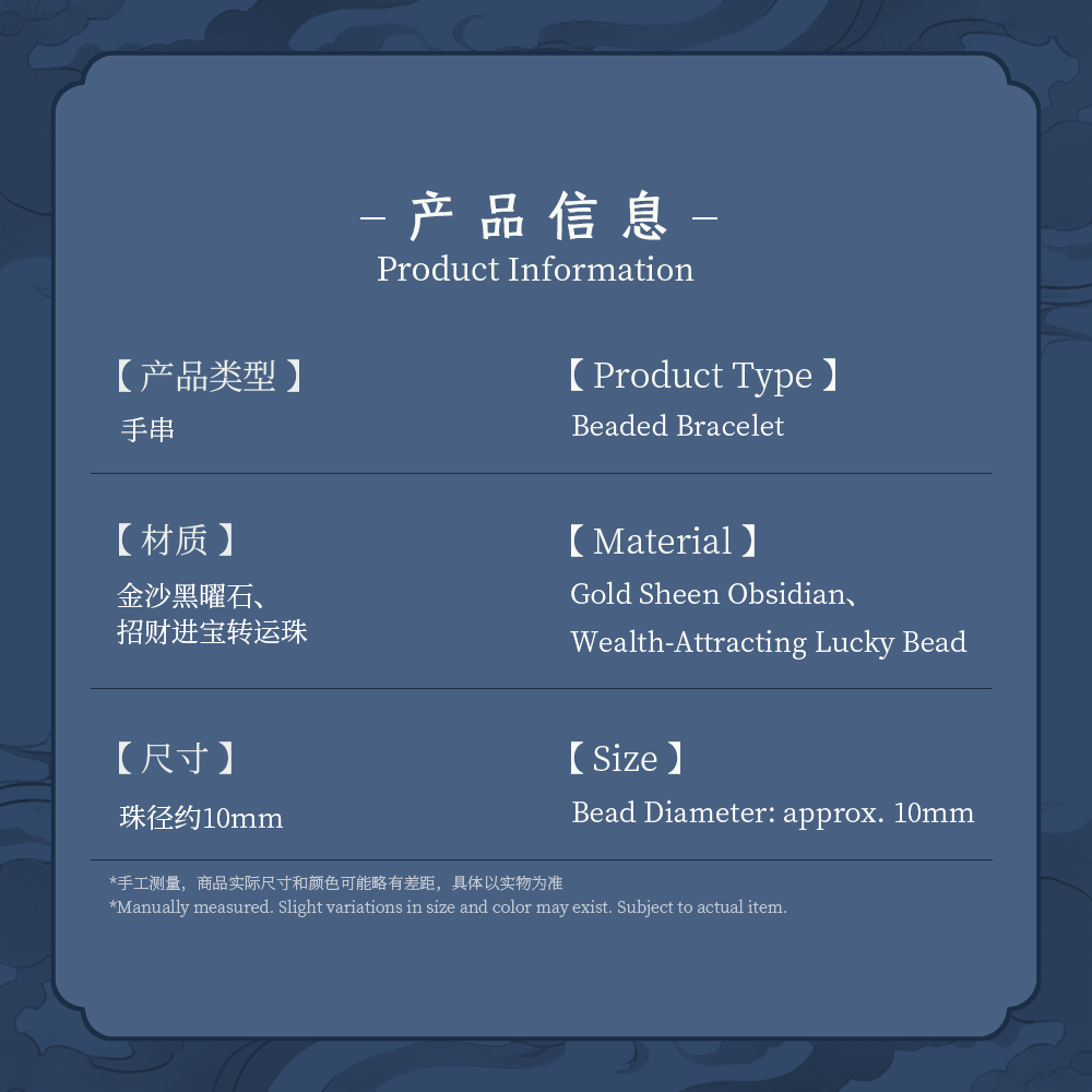 Rooted in thousand-year-old Eastern wisdom and crafted with modern techniques. Each piece follows traditional Eastern principles of elemental interactions, designed under the guidance of experienced cultural heritage experts. While carrying beautiful blessings for the wearer, it also serves as a fashionable accessory for daily wear. May you be as resilient as obsidian and as brilliant as golden beads.